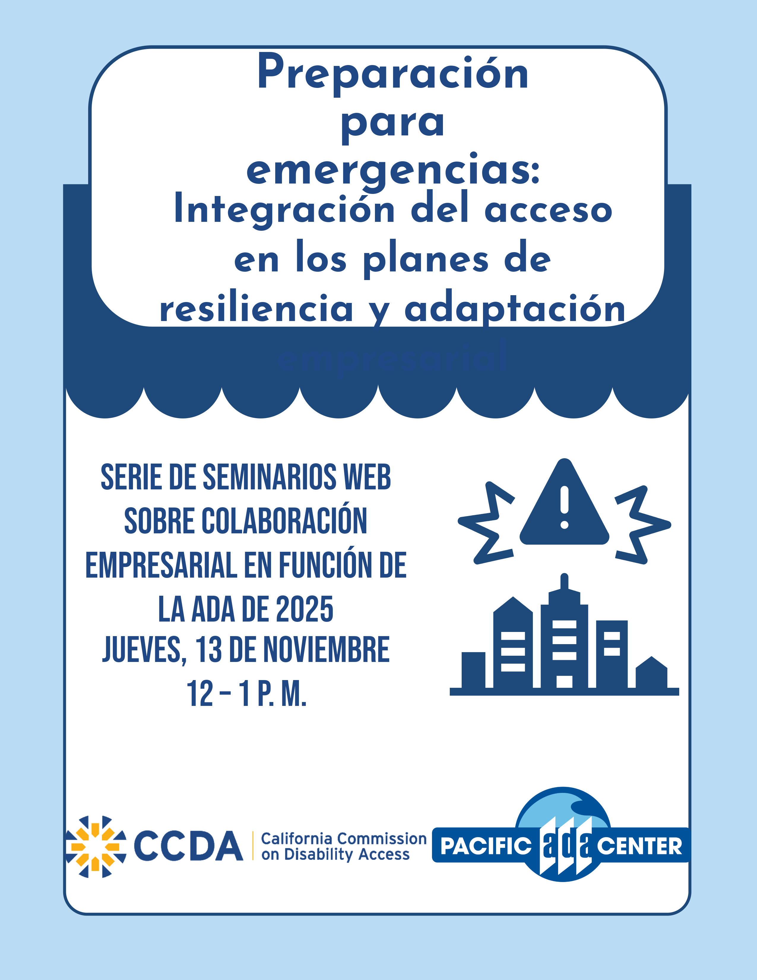In this final 2025 Lunch & Learn webinar, the CCDA in collaboration with the Pacific ADA Center, will provide information to help businesses learn how to maintain operational resilience while upholding accessibility during emergencies. The event will provide an overview of emergency preparedness considerations, the role of accessibility in business continuity, and how temporary changes in business functions might impact access for customers and employees with disabilities.