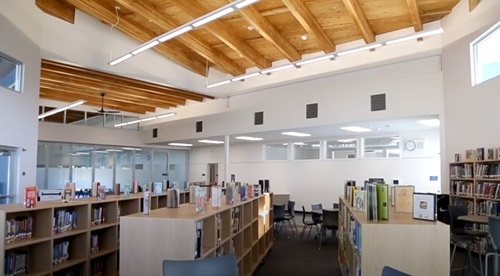 In 2019, construction of a new Library and Administration Building was completed, incorporating design elements with a focus on energy efficiency and sustainability along with an efficient, eco-friendly hydroponic VAV system for conditioning that reduced electricity use by 30 percent. Passive design features included expansive glass storefronts and clerestory windows with large overhangs at the entry. Retractable glass partition walls open the building’s spaces to daylight, expanding interior uses while providing flexibility for learning. The storefronts blur the separation of building to the outdoors, letting the views tie the building to the outdoors and connect with the landscape. Natural tones in the exterior finishes are inspired by the surrounding landscape and minimize the visual impact. This building received an Award of Excellence in 2021 for Outstanding Project by Learning by Design for its design emphasis on natural lighting, natural colors and views that allow the building users to interact with the surrounding environment.