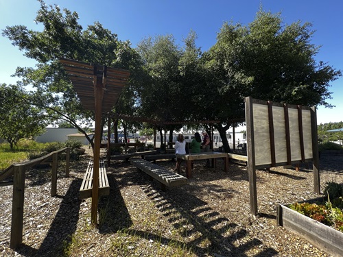 At SVS native plantings and xeriscape areas comprise the campus landscape. Student vineyards are part of the established garden areas and shade trees minimize the heat island effect in planters and provide cool spaces in playground areas. Two large pole barns were erected to create additional shade for student outdoor areas. Clean mulch, provided by the City of Fairfield from its local tree-trimming efforts, is diverted from the area’s landfills to the school and used in landscape areas to help preserve irrigation water and minimize maintenance.