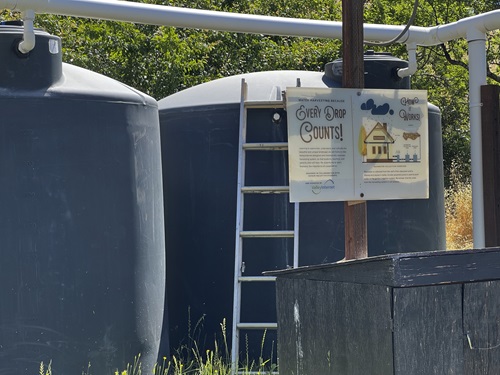 The campus agricultural plots, gardens, and vineyards necessitate irrigation to keep these areas thriving. The school is in an area that is fed by a system of aqueducts that bring water into the farmlands, supplementing the sparse rainfall typical of the region. The Solano Irrigation District diverts irrigation water away from non-essential agricultural areas during the established rainy season of October through April and SVS is one of the entities that do not receive irrigation water during this time; therefore, conserving water and safeguarding its availability is critical for its agriscience program, and necessitating student experimentation with methods of water reclamation. As a testament to innovation, a group of seventh grade students engineered a water harvesting system by installing rooftop drainpipes along the façade of a classroom building near the gardens and connecting it to two 2,500-gallon water tanks at the end of the building. The system includes an eco-friendly and efficient first flush rain diverter to clean the debris from the collected water before it enters a pressure tank with a pump powered by a solar battery, eliminating the need to use the campus’s potable water or grid power for irrigation.