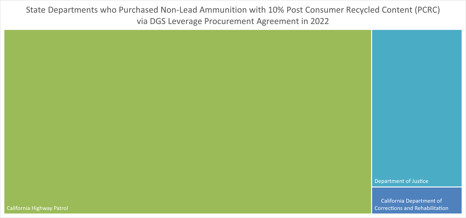 As part of the state’s commodity contracts, both lead and non-lead ammunition options are offered to state agencies. In line with the state’s environmental goals to reduce lead ammunition and increase post-consumer recycled content in products, in 2022, the state spent a total of $149,453.80 towards the procurement of non-lead ammunition containing 10 percent PCRC. Notably, the California Highway Patrol accounted for 80 percent of these purchases.
