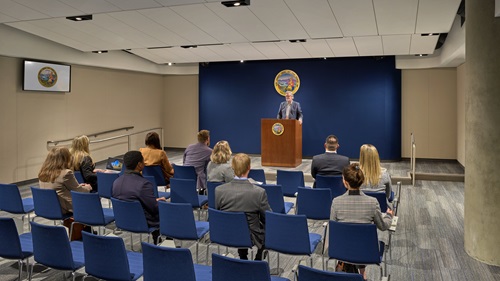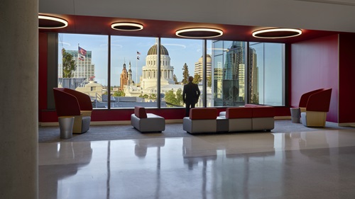 - Sustainability: The LEED Platinum certified building is one of the most sustainable state office buildings to house elected officials in the country, and features low water use fixtures, a high-performance building façade, materials with high recycled content, daylighting within office suites, native vegetation on the surrounding site and terraces, as well as LED lighting throughout.