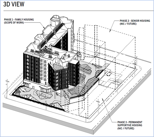 The Employment Development Department vacated three old buildings, and the site was determined to be suitable for housing. The large, ± 1.46 acres will provide opportunities for open space and housing. This is the first phase of three phases.