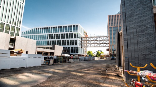 Ground level view of site work between Richards Boulevard Office Complex buildings